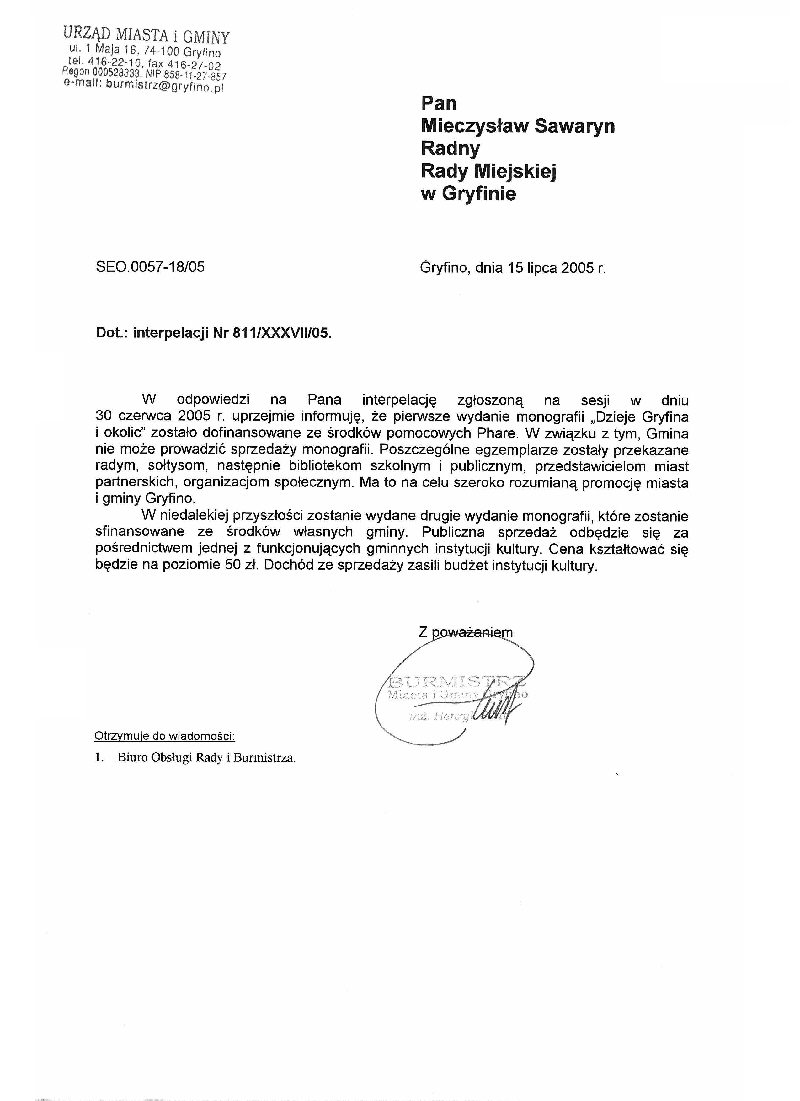 811/XXXVII/05 - ile kosztuje jeden egzemplarz monografii "Dzieje Gryfina i Okolic". Chcę zapłacić za egzemplarz, który otrzymałem. Uważam, że darowanie książki dla każdego radnego jest niestosowne, gdyż każdy obywatel Gryfina chcąc mieć taką książkę będzie musiał kupić ją sobie. Osobiście nie chcę być traktowany inaczej niż pozostali obywatele naszego miasta.