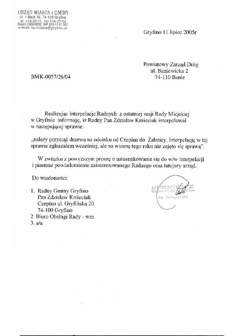 804/XXXVII/05 - należy przyciąć drzewa na odcinku od Czepina do Żabnicy. Interpelację w tej sprawie zgłaszałem wcześniej, ale na wiosnę tego roku nie zajęto się sprawą.
