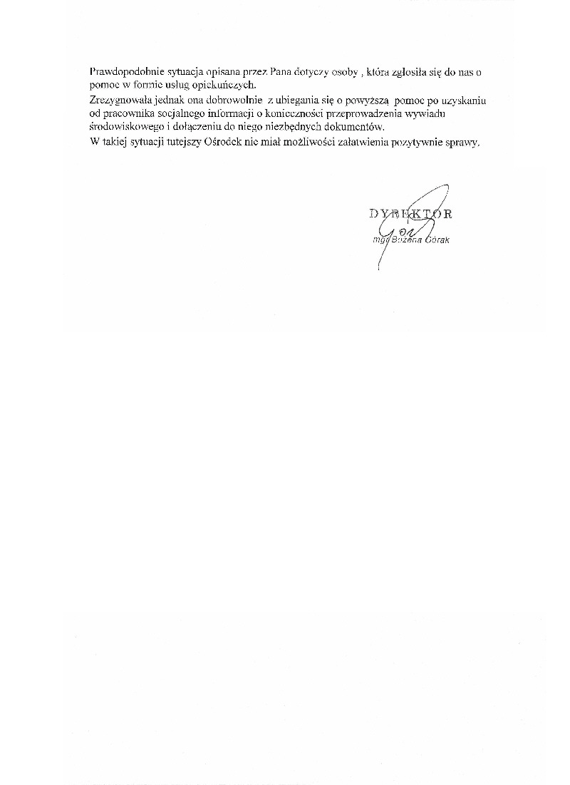 812/XXXVII/05 - w Gryfinie jest rodzina, która ma niepełnosprawne, ciężko chore dziecko. W ostatnim czasie następne dziecko z tej rodziny, córka miała wypadek. Przez kilka miesięcy leżała w szpitalu, ale do dnia dzisiejszego nie odzyskała przytomności. Obecnie przebywa w domu. Matka, była pracownica OPS opiekuje się dwójka ciężko chorych dzieci. Brakuje im środków do życie i dlatego zgłosiła się po pomoc do OPS. Ośrodek Pomocy Społecznej zażądał od tej pani bardzo dużo różnych dokumentów, zaświadczeń, itp. Osoba opiekująca się dwójką bardzo ciężko chorych dzieci nie jest w stanie sama zebrać potrzebne dokumenty. Proszę o podjęcie działań mających na celu ułatwienie osobom będącym w trudnej sytuacji finansowej opieki nad rodziną.