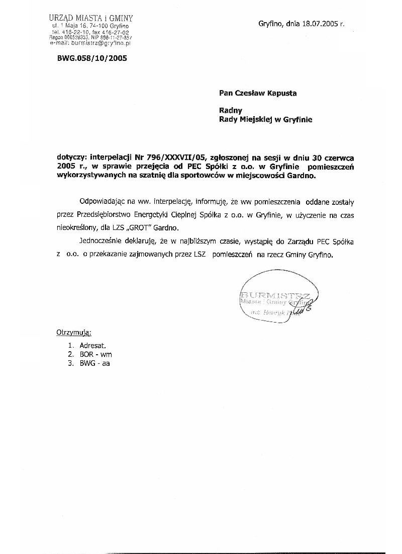 796/XXXVII/05 - proszę o załatwienie sprawy związanej z prawnym przejęciem od PEC pomieszczenia w Gardnie, w którym obecnie mieści się szatnia dla sportowców. Istnieje obawa, że PEC po restrukturyzacji może sprzedać ww. pomieszczenie.