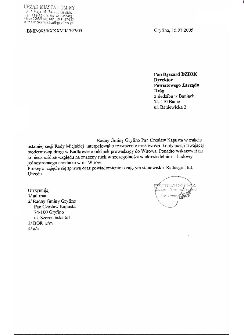 797/XXXVII/05 - cieszy nas, że w Bartkowie wybudowano nową drogę, ale w dalszej części ta sama droga do Wirowa jest w bardzo złym stanie. Należy naprawić ww. drogę, a na terenie wsi wybudować chodnik przynajmniej po jednej stronie ulicy. W okresie letnim jest tam duży ruch samochodowy. Proszę p. Starostę Powiatu Gryfińskiego o zajęcie się sprawą.