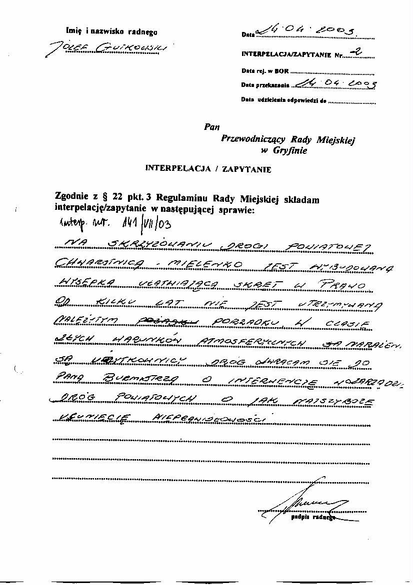 Ad. 126/VII/03 - podczas zgłaszania interpelacja na sesji obecny był Komendant Policji. Mam nadzieję, że zajmie się sprawą, o której mowa w interpelacji.