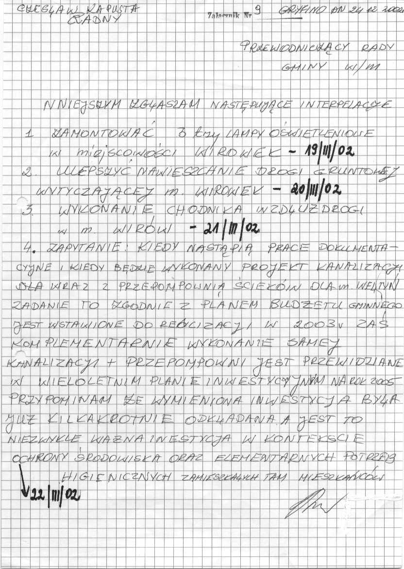 Ad.19/III/02 - realizacja w/w interpelacji zostanie rozpatrzona pod kątem posiadanych w budżecie gminy środków finansowych. Wszystkie interpelacje są słuszne. Natomiast kiedy będą zrealizowanie odpowiem na piśmie.
