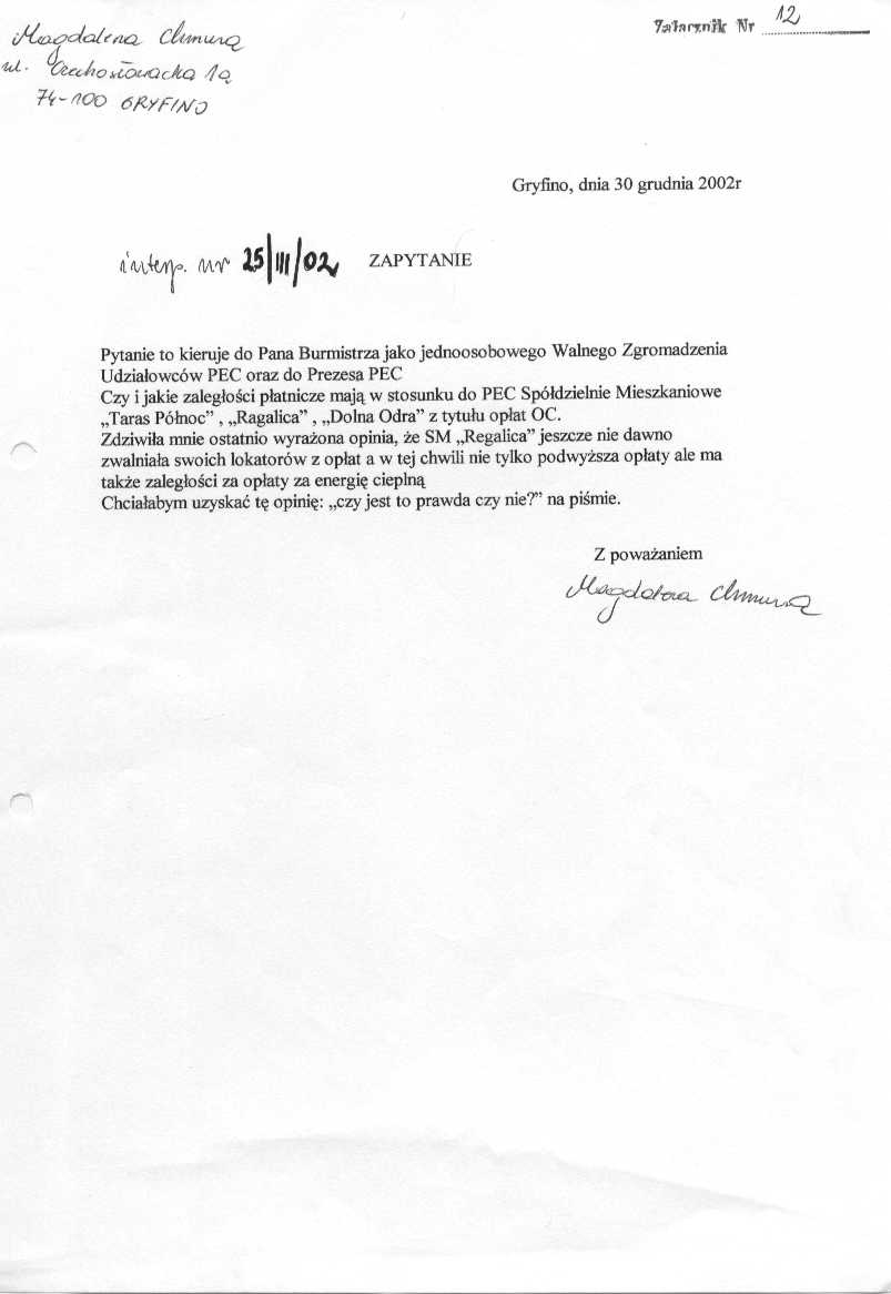28/III/02 - proszę o dostarczenie mi na piśmie informacji Burmistrza przedstawionej na dzisiejszej sesji o pracach podejmowanych w okresie międzysesyjnym i z wykonania uchwał Rady.