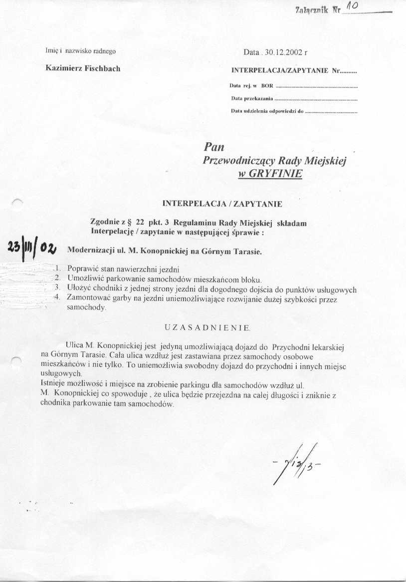 Radny Kazimierz Fischbach 23/III/02 - załącznik nr 10.