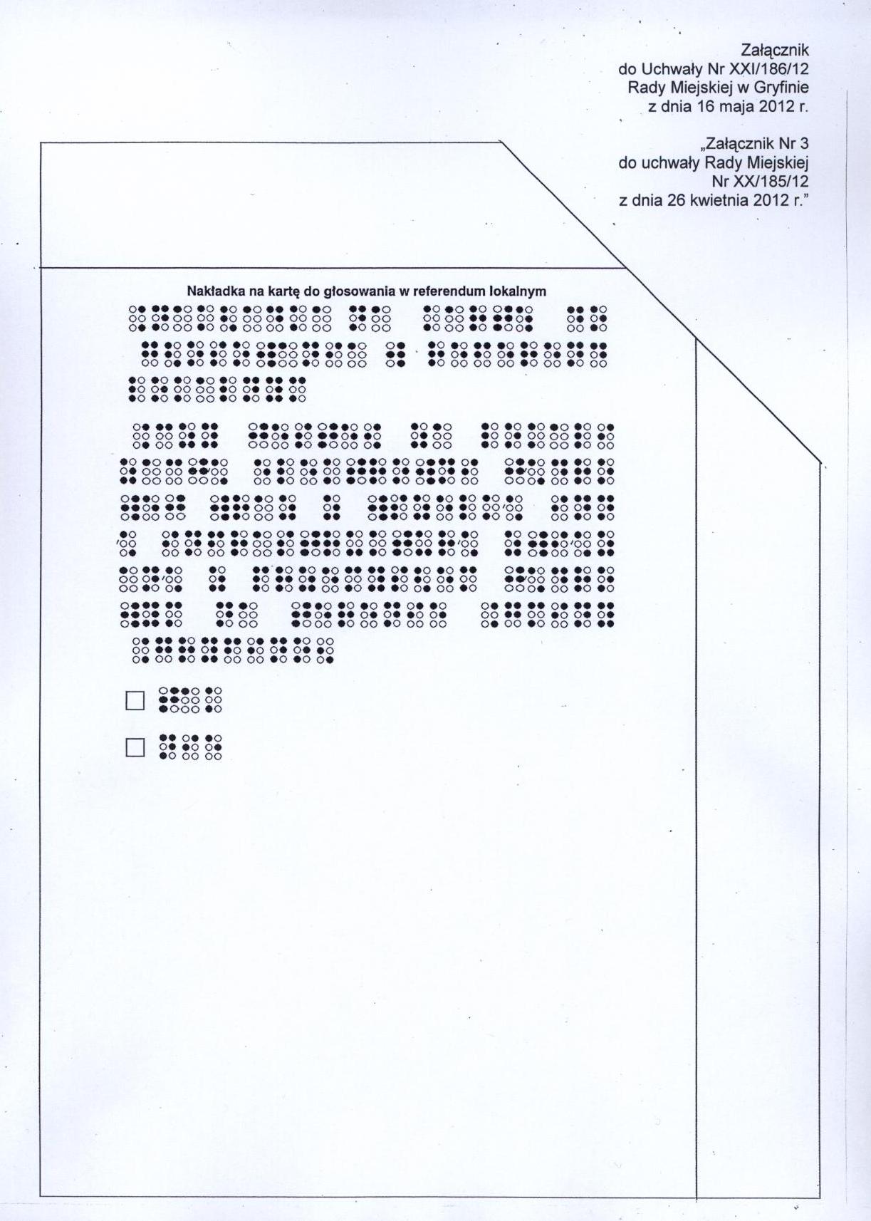Rada Miejska w Gryfinie w dniu 26 kwietnia 2012 r. podjęła Uchwałę Nr XX/185/12 w sprawie przeprowadzenia referendum lokalnego dotyczącego lokalizacji elektrowni jądrowej wraz z wszelką inną infrastrukturą związaną z przemysłem jądrowym, w której nie określiła w załączniku do uchwały wzoru nakładki na kartę do głosowania sporządzonej w alfabecie Braille`a. Przepisy ustawy o referendum lokalnym precyzują wymogi dotyczące uchwały w sprawie przeprowadzenia referendum, podejmowanej przez organ stanowiący jednostki samorządu terytorialnego. Konieczne zatem staje się podjęcie uchwały, ustanawiającej w załączniku wzór nakładki na kartę do głosowania sporządzoną w alfabecie Braille`a.
