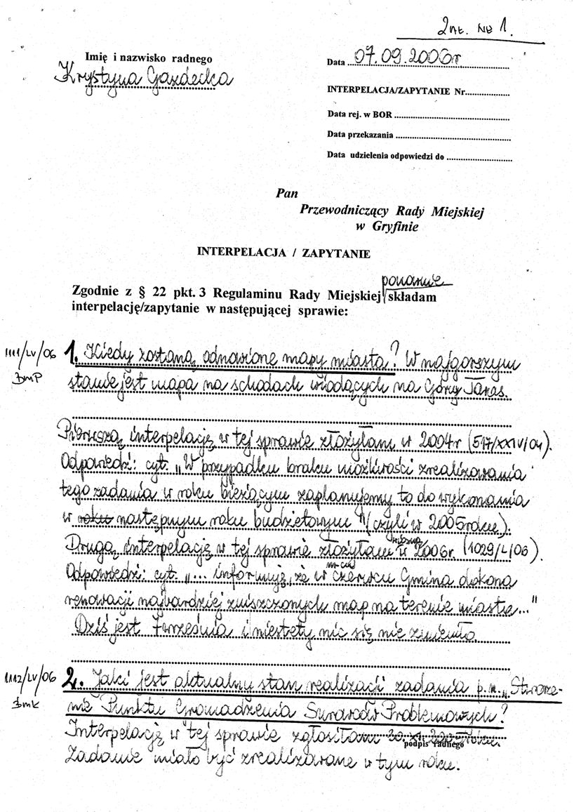 Interpelacje i zapytania radnych zgłoszone na LV sesji Rady Miejskiej w Gryfinie w dniu 7 września 2006r.