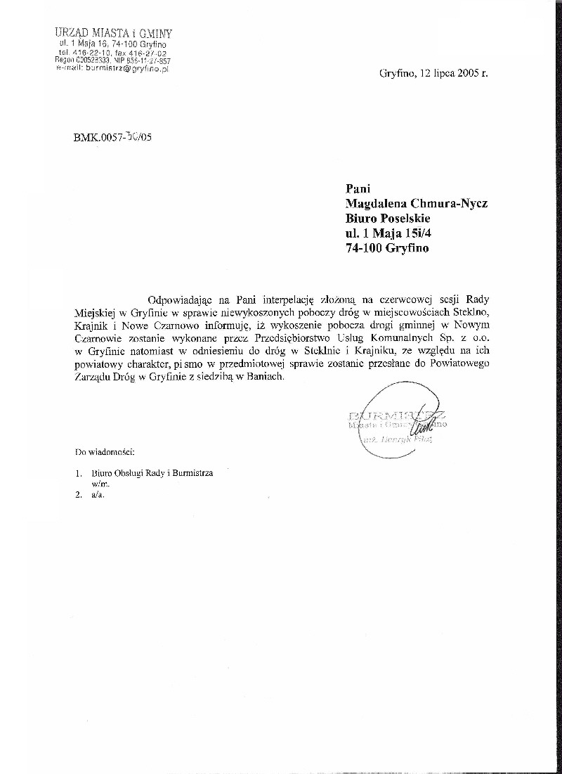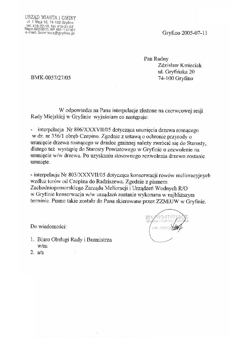 Ad.801/XXXVII/05 - w sprawie działki nr 167, przy ul 1 Maja w Gryfinie doszło do ugody ze Starostwem Powiatowym. Uważam, że propozycja podziału ww. działki jest logiczna. W najbliższym czasie sprawa zostanie załatwiona.
