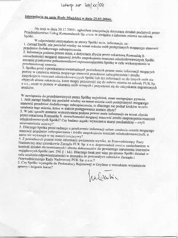 413/XX/04 - w gazecie „Nowe 7 Dni Gryfina” z dnia 24 marca 2004r. ukazał się artykuł, pt. „Pół miasta wiedziało”. W artykule tym była Skarbnik Urzędu Miasta i Gminy powołując się na p. Franciszka Zawieruchy zarzuca mu, iż wręcz zabronił byłemu Burmistrzowi interweniować w sprawy PUK. Jest to nieprawda. Na każde posiedzeniu Komisji Rolnictwa, Handlu Usług i Inicjatyw Gospodarczych zapraszaliśmy przedstawicieli PUK oraz p. Ochmańską i domagaliśmy się informacji w sprawie PUK. Nigdy nie otrzymaliśmy wyczerpujących informacji. Nie można z człowieka robić ofiary tylko dlatego, że nie ma się jak bronić. Proszę Przewodniczącego Rady by zajął stanowisko w tej sprawie. Dlaczego nic nie robiła w sprawie osoba delegowana do pracy w Zarządzie PUK?. To właśnie ta osoba powinna ponieść konsekwencje za zatajenie prawdy. Dziwię się redaktorom gazety, że nie zapytali drugiej strony, co ma do powiedzenia w sprawie. Nie można krzywdzić człowieka, który wiele dobrego zrobił dla Gryfina.