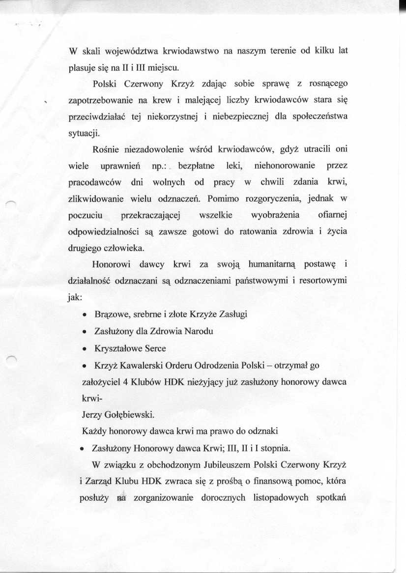 275/XII/03 - Honorowi Dawców Krwi proszą o pomoc finansową na zorganizowanie obchodów 45 – lecia powstania Klubu Honorowych Krwiodawców. Proszą również o pomoc w zorganizowaniu jubileuszu. Chcieli by wiedzieć, czy istnieje możliwość zorganizowania obchodów w sali obrad Urzędu Miasta i Gminy w Gryfinie. Wpłynęło do mnie pismo ( strona1, strona2, strona3, strona4, strona5) w którym Klub Honorowych Dawców Krwi przy PCK w Gryfinie zwraca się do p. Burmistrza z prośbą o objęcie patronatu nad Klubem. Pismo w załączeniu. Władze Miejskie Szczecina zagwarantowały dla Honorowych Dawców Krwi darmowe przejazdy autobusami po Szczecinie. Było by wskazane, aby nasza gmina dla najbardziej zasłużonych dawców krwi również zagwarantowała darmowe przejazdy autobusami.