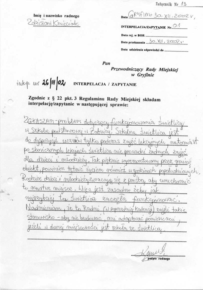 Radny Zdzisław Kmieciak 26/III/02, 27/III/02 - załącznik nr 13 i załączniki 14.