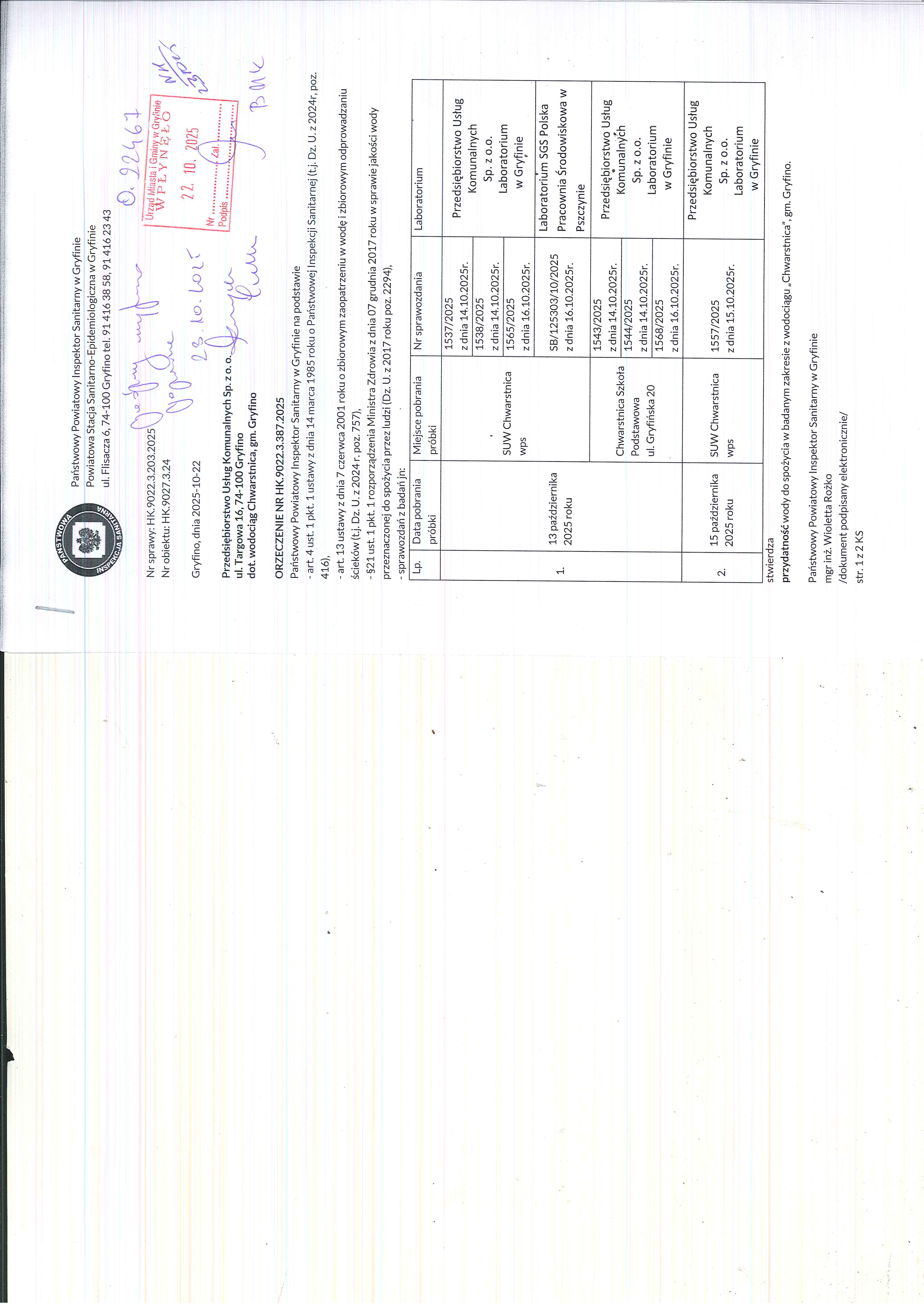 Informacja z dnia 22 października 2025 r. o przydatności wody do spożycia z wodociągu "Chwarstnica" [718968 bajtów]