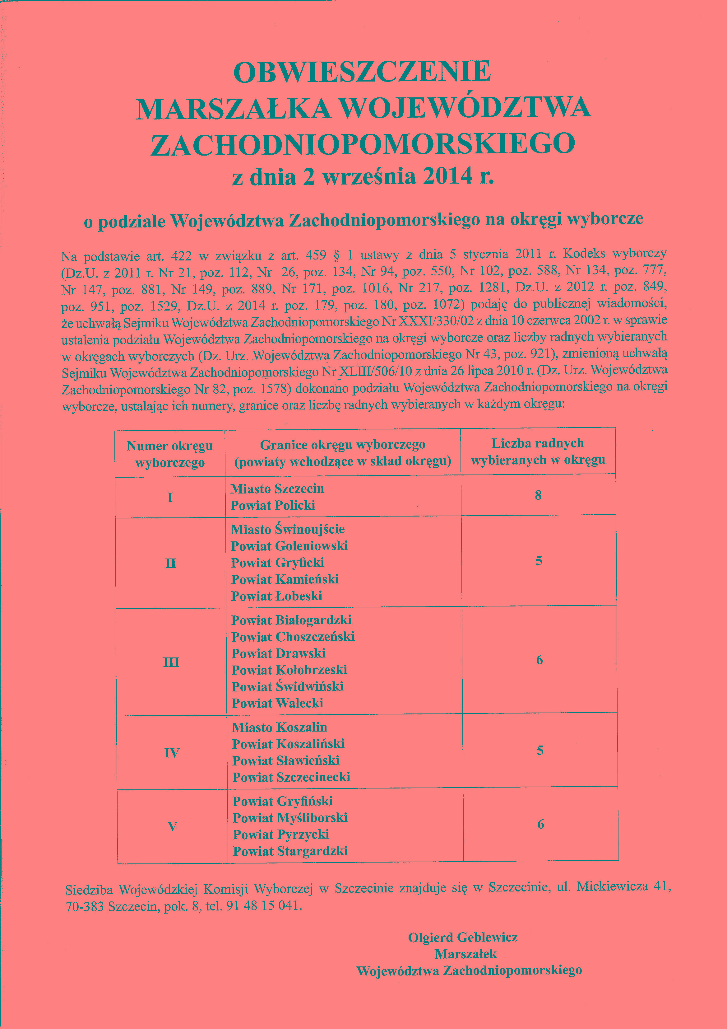 OBWIESZCZENIE MARSZAŁKA WOJEWÓDZTWA ZACHODNIOPOMORSKIEGO z dnia 2 września 2014 r. o podziale Województwa Zachodniopomorskiego na okręgi wyborcze