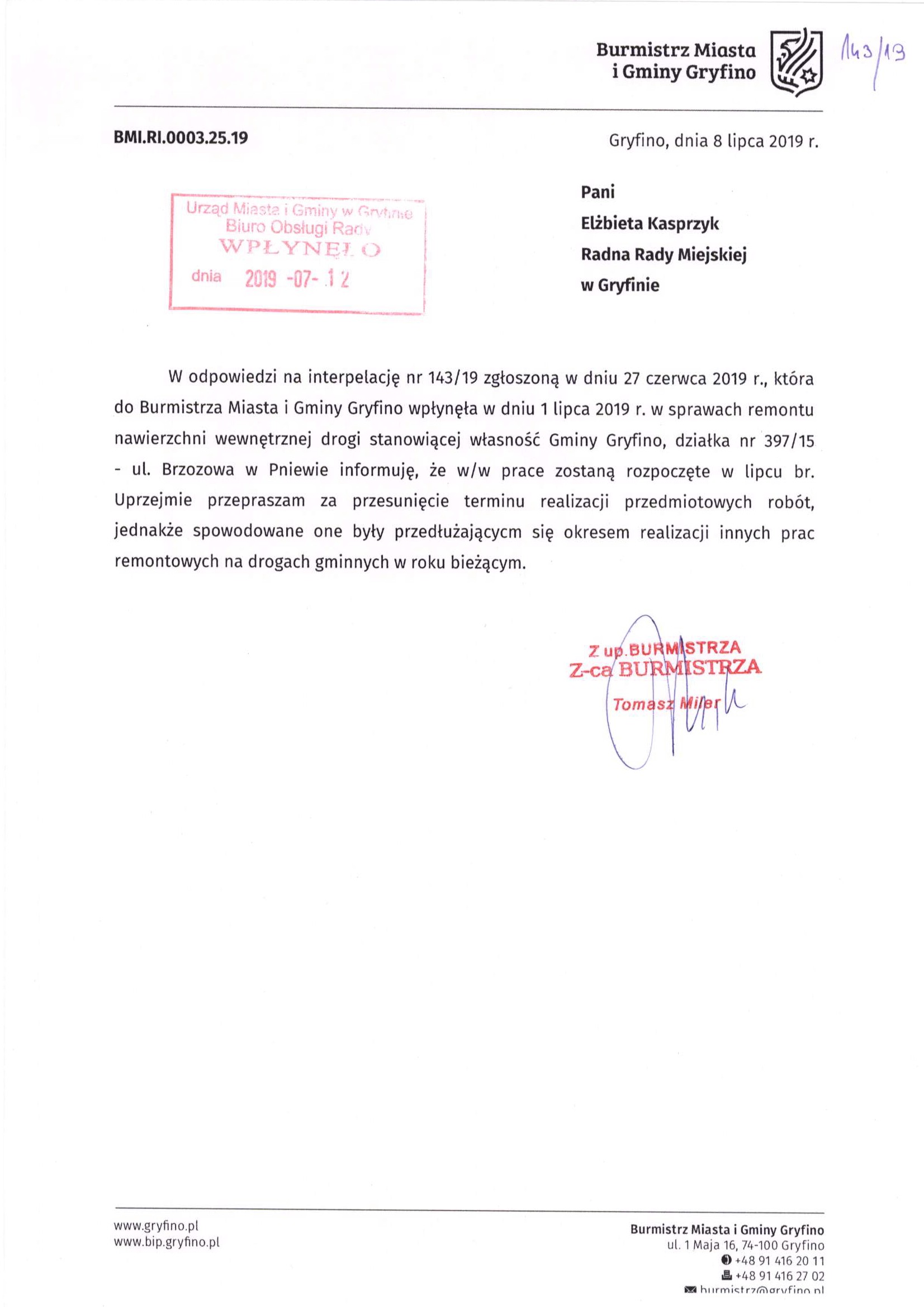 | IV | 2/19 | Tomasz Namieciński | Dot. remontu drogi gminnej | odpowiedź |