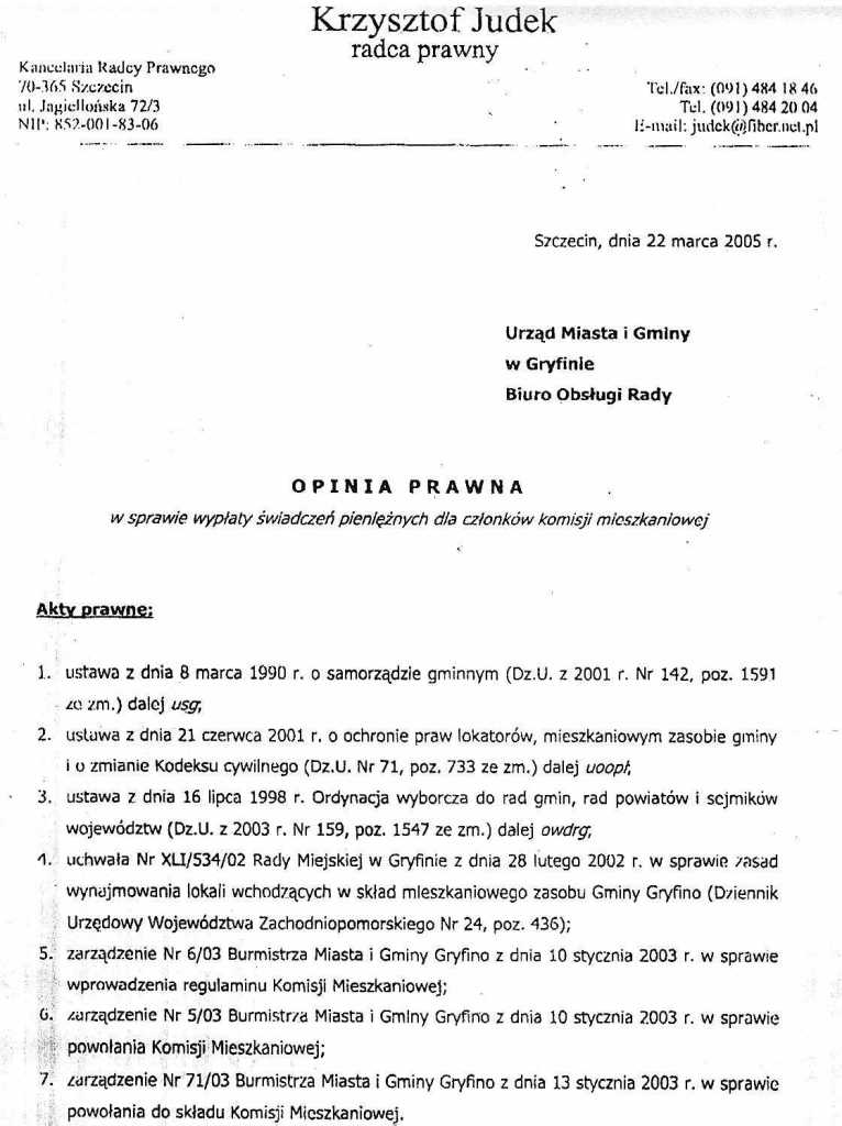 Opinia prawna w sprawie wypłaty świadczeń pieniężnych dla członków komisji mieszkaniowej