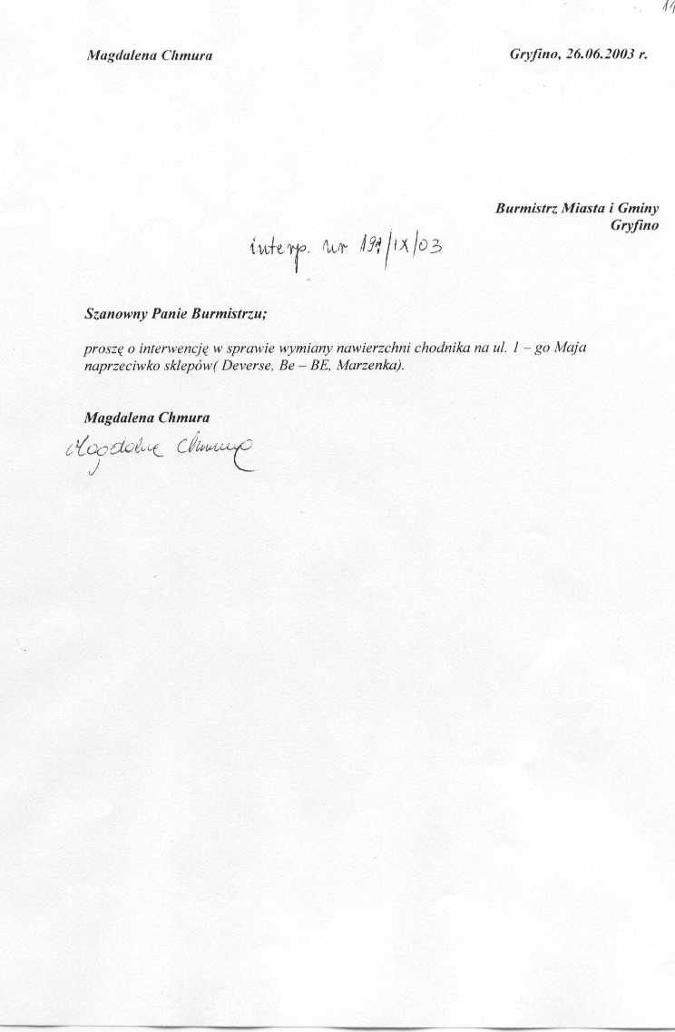 186/IX/03 - podczas przerwy w obradach sesji dowiedziałem się, że w miejscowości Wełtyń w dniu dzisiejszym zostały wymienione wszystkie znaki drogowe. Mieszkańcy Wełtynia nie są zadowoleni z ustawionych znaków drogowych. Uważają, że oznakowanie powinno być w wersji pierwotnej. Należy również w dwóch miejscach na skrzyżowaniach drogi zamontować lustra. Proszę o zajęcie się sprawą. Chciałbym się również dowiedzieć dlaczego wbrew woli mieszkańców zamontowane nowe znaki?
