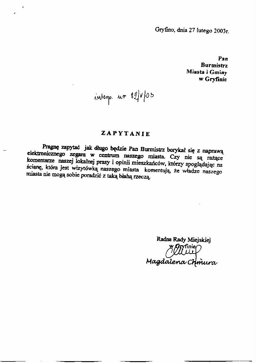 Interpelacje  i  zapytania  radnych  zgłoszone  na  V  sesji  Rady  Miejskiej  w  Gryfinie w  dniu  27  lutego  2003r.