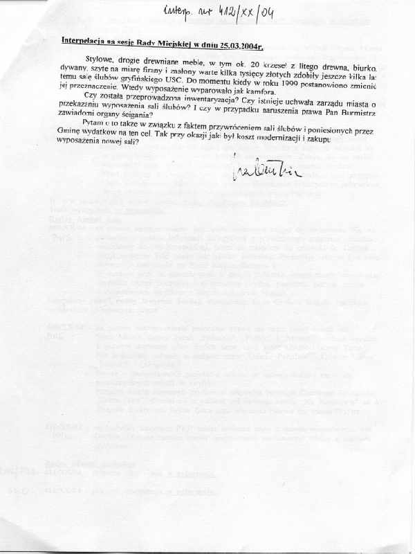 413/XX/04 - w gazecie „Nowe 7 Dni Gryfina” z dnia 24 marca 2004r. ukazał się artykuł, pt. „Pół miasta wiedziało”. W artykule tym była Skarbnik Urzędu Miasta i Gminy powołując się na p. Franciszka Zawieruchy zarzuca mu, iż wręcz zabronił byłemu Burmistrzowi interweniować w sprawy PUK. Jest to nieprawda. Na każde posiedzeniu Komisji Rolnictwa, Handlu Usług i Inicjatyw Gospodarczych zapraszaliśmy przedstawicieli PUK oraz p. Ochmańską i domagaliśmy się informacji w sprawie PUK. Nigdy nie otrzymaliśmy wyczerpujących informacji. Nie można z człowieka robić ofiary tylko dlatego, że nie ma się jak bronić. Proszę Przewodniczącego Rady by zajął stanowisko w tej sprawie. Dlaczego nic nie robiła w sprawie osoba delegowana do pracy w Zarządzie PUK?. To właśnie ta osoba powinna ponieść konsekwencje za zatajenie prawdy. Dziwię się redaktorom gazety, że nie zapytali drugiej strony, co ma do powiedzenia w sprawie. Nie można krzywdzić człowieka, który wiele dobrego zrobił dla Gryfina.