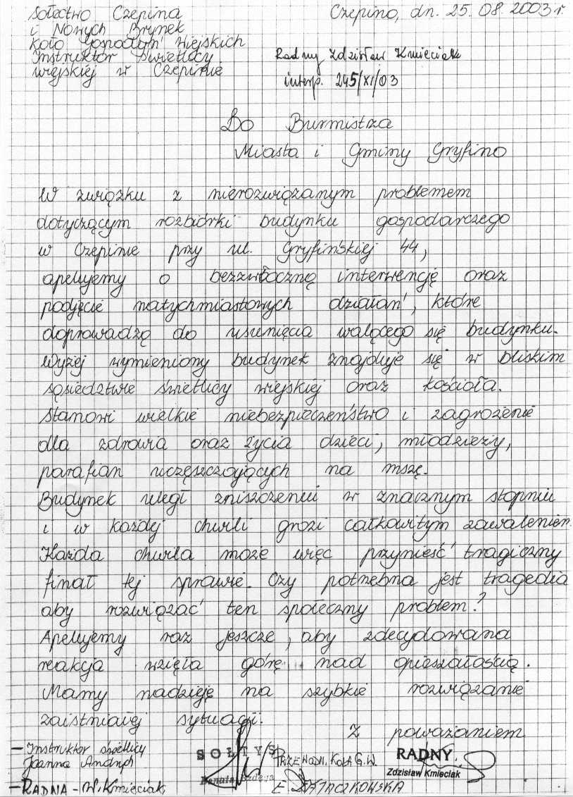 245/XI/03 - wpłynęło do mnie pismo dotyczące rozbiórki walącego się budynku gospodarczego w Czepinie przy ul. Grunwaldzkiej 44 - załącznik nr 8. (strona 1, strona 2).