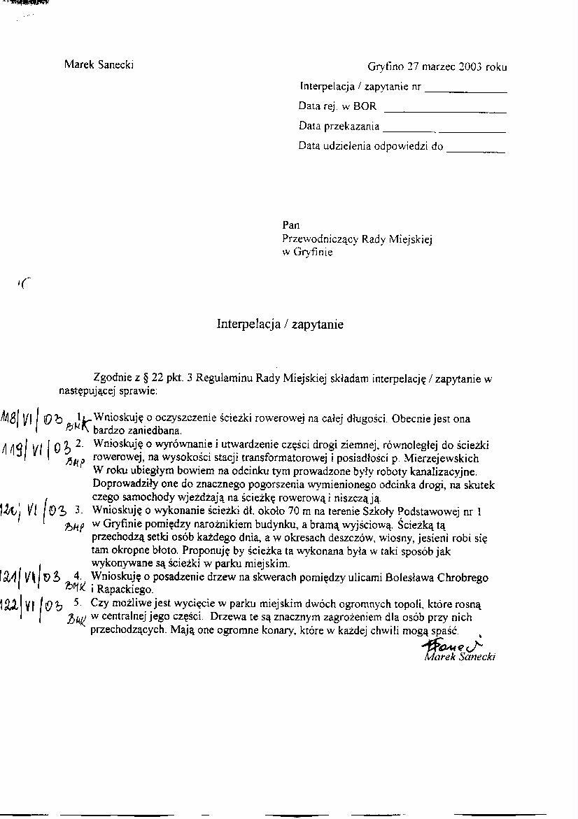 110/VI/03 - otrzymałem pismo, że przystanki autobusowe na trasie Gryfino - Szczecin będą sprzątane raz w tygodniu, a nie jak poprzednio raz w miesiącu. Oświadczam, że nie były one nigdy sprzątanie raz w miesiącu i nie są sprzątane raz w tygodniu. Kiedy będą sprzątane w/w przystanki?